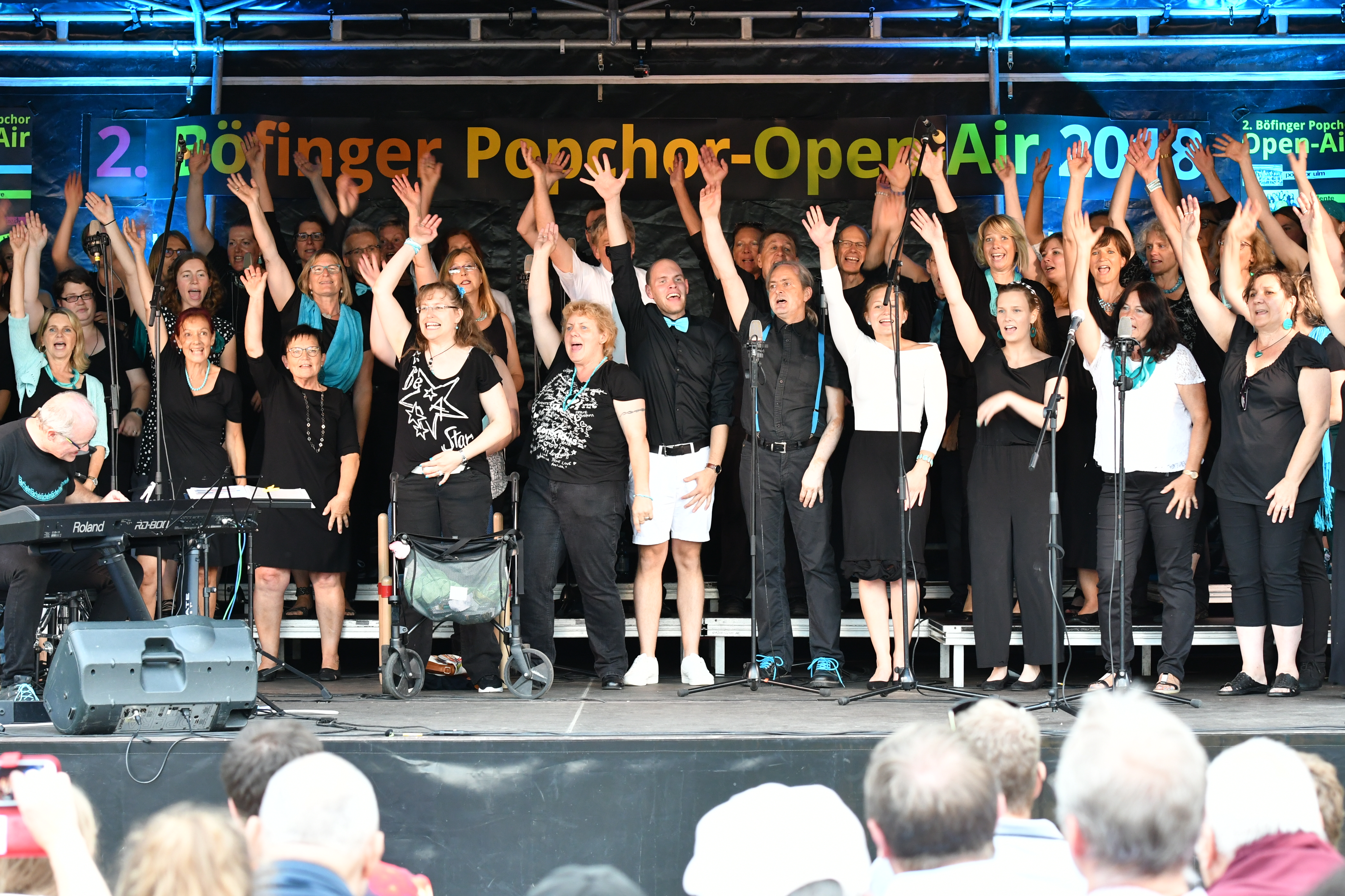 Der Popchor Ulm e.V. unter Leitung von Roland M. Eppelt steht für Spaß, Qualität und gute Gemeinschaft. Titel wie „Happy“, „We are the world“, „The Time Warp“ singt das 70-köpfige Ensemble mit sichtbarer Freude. Mit dem 3. Böfinger Popchor-Open-Air feiert der Chor diesen Sommer sein dreijähriges Bestehen.